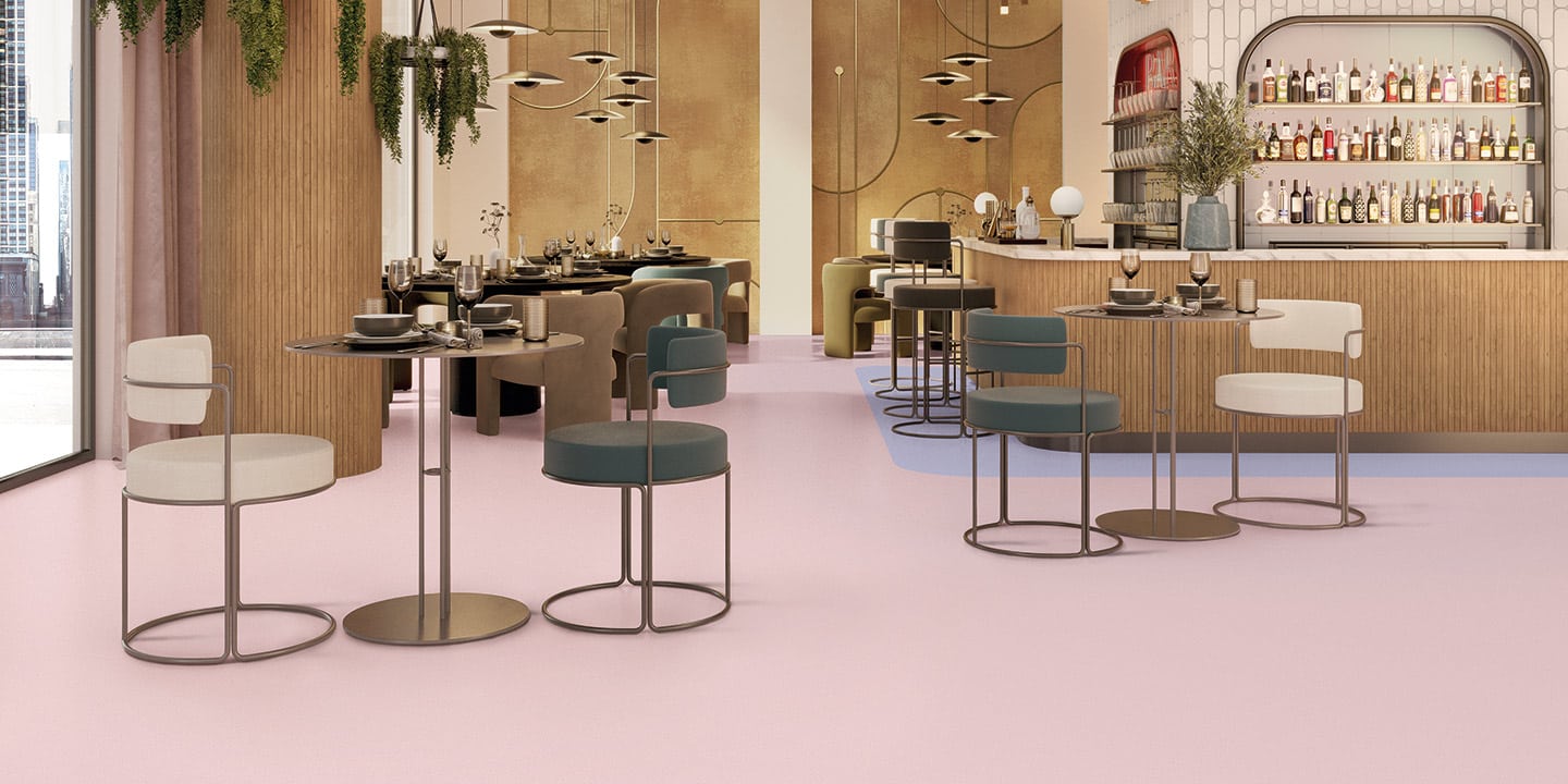 Pavimento vinlico etereogneo, a posa libera, presso-calandrato, preparazione del sottofondo ridotta grazie alla tecnologia Easy Fit con rovescio goffrato. Prodotto accreditato Dementia Design.