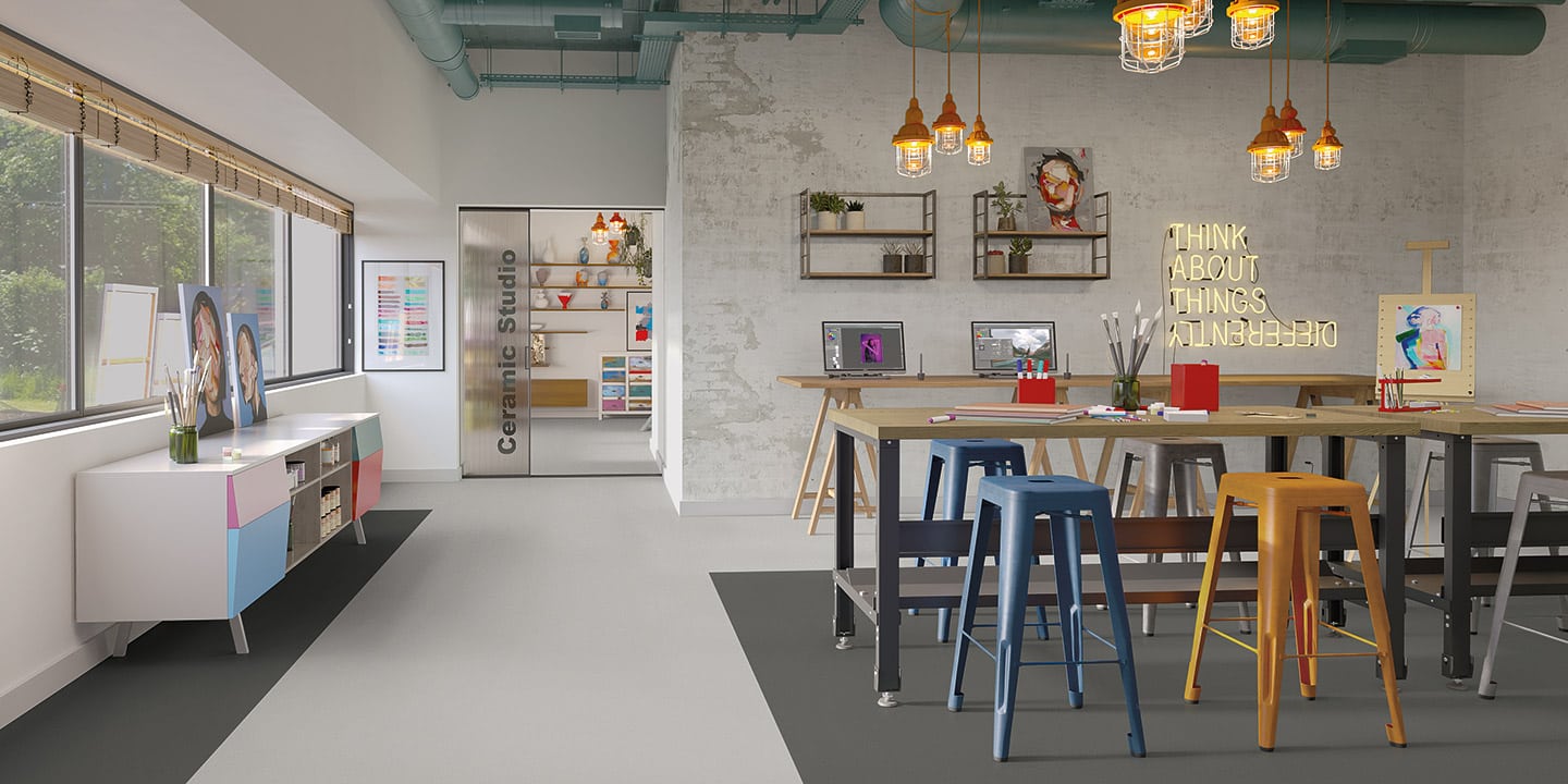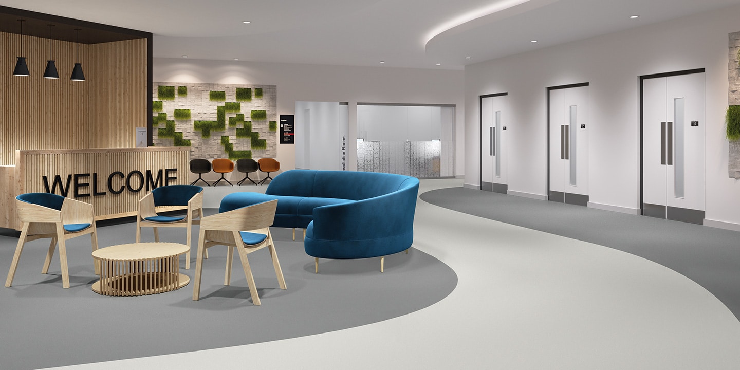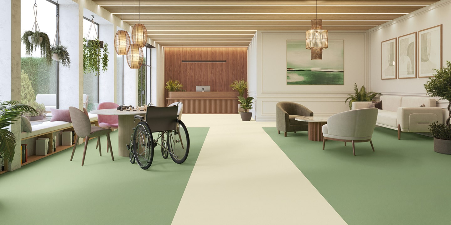 Pavimento vinlico etereogneo, a posa libera, presso-calandrato, preparazione del sottofondo ridotta grazie alla tecnologia Easy Fit con rovescio goffrato. Prodotto accreditato Dementia Design.