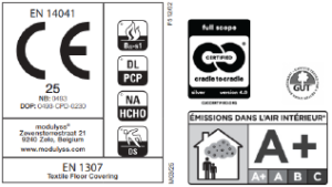 100% filato Econyl®; 100% Solution Dyed Nylon rigenerato. Sottofondo secondario EcoBack: supporto a quadrotte completamente riciclabile a base di poliolefine con un minimo 70% di contenuto riciclato postindustriale.