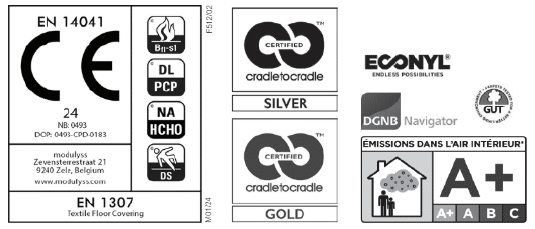 100% filato Econyl®; 100% Solution Dyed Nylon rigenerato. Sottofondo secondario EcoBack: supporto a quadrotte completamente riciclabile a base di poliolefine con un minimo 70% di contenuto riciclato postindustriale.