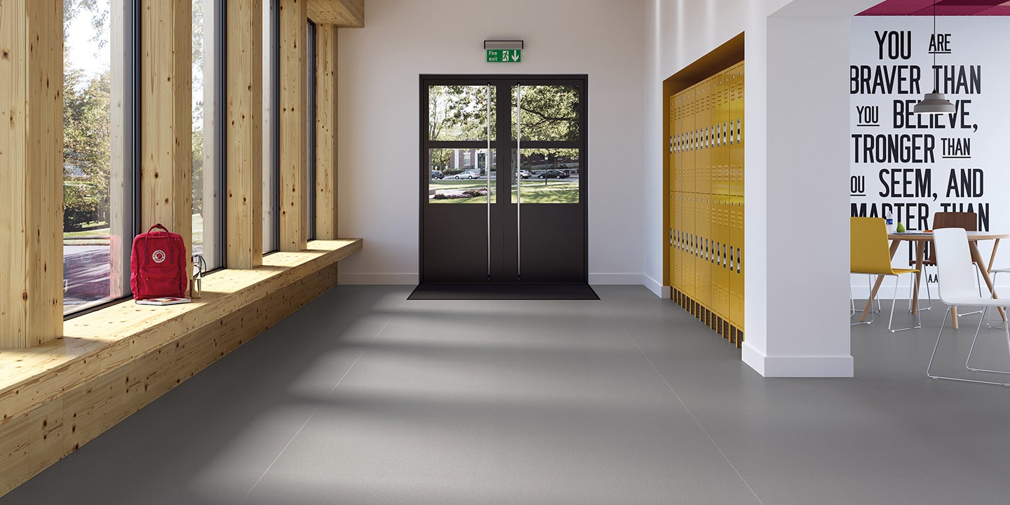 Contiene un’alta percentuale di materiale riciclato; riciclabile al 100%; PVC con design a rilievo “chiodato”. La superficie è arricchita con particelle di ossido di alluminio, quasi invisibili a occhio nudo, che sono la chiave della sua resistenza allo scivolamento. Presenta un rivestimento in poliuretano (PUR) che lo rende resistente all’abrasione e facile da pulire e manutenere.