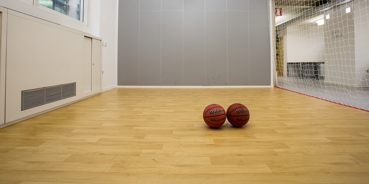 Pavimento sportivo in vinile resistente, disponibile con motivi in legno e tinte unite.